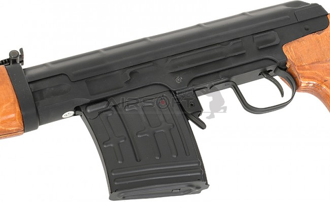 Replica airsoft sniper SVD Dragunov AEG (CM057), cu functionare electrica, este fabricata din metal si lemn natural. Aceasta foloseste un sistem electric puternic care impune bilei o viteza mare. Replica are un sistem hop-up reglabil care permite reglarea fina a directiei bilei pe plan vertical. Se poate atasa luneta originala sau o alta luneta cu ajutorul unei baze de montare separata.
